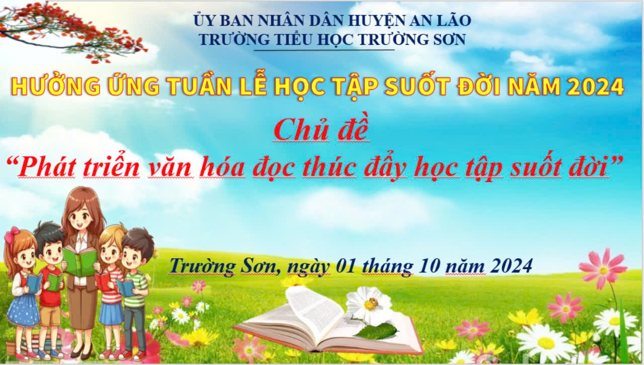 Hoà chung không khí tưng bừng của cả nước hướng tới Tuần lễ hưởng ứng học tập suốt đời (01/10/2024 - 07/10/2024), trường TH Trường Sơn đã tổ chức các hoạt động hưởng ứng Tuần lễ học tập suốt đời năm 2024 với chủ đề “Phát triển văn hóa đọc thúc đẩy học tập suốt đời” bằng các hoạt động: