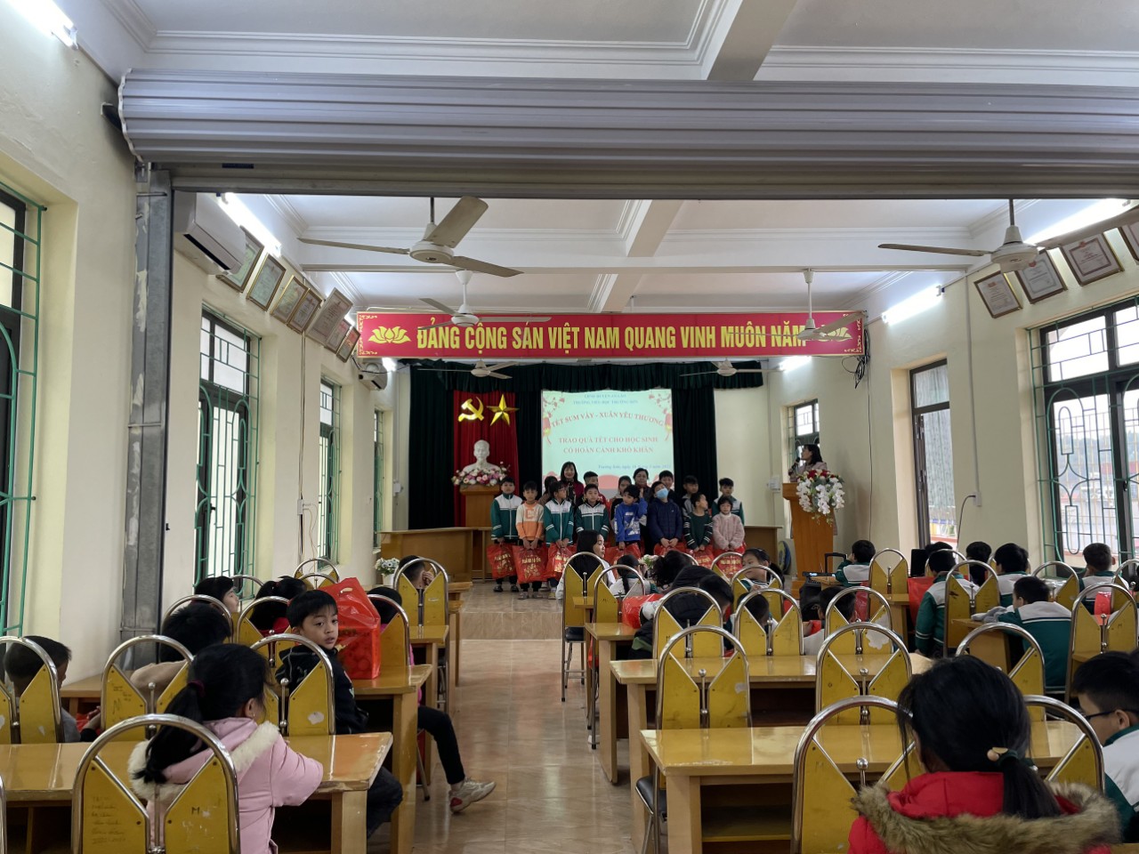 Đồng thời Liên đội tổ chức hoạt động " Tết sum vầy- Xuân yêu thương", với tinh thần nhân đạo, tương thân tương ái của các bạn học sinh trong liên đội, nhằm động viên các bạn khó khăn đón tết Quý Mão thật đầm ấm. BGH nhà trường kết hợp với Ban đại diện cha mẹ HS nhà trường đã tặng 51 suất quà Tết cho học sinh có hoàn cảnh khó khăn trong liên đội.