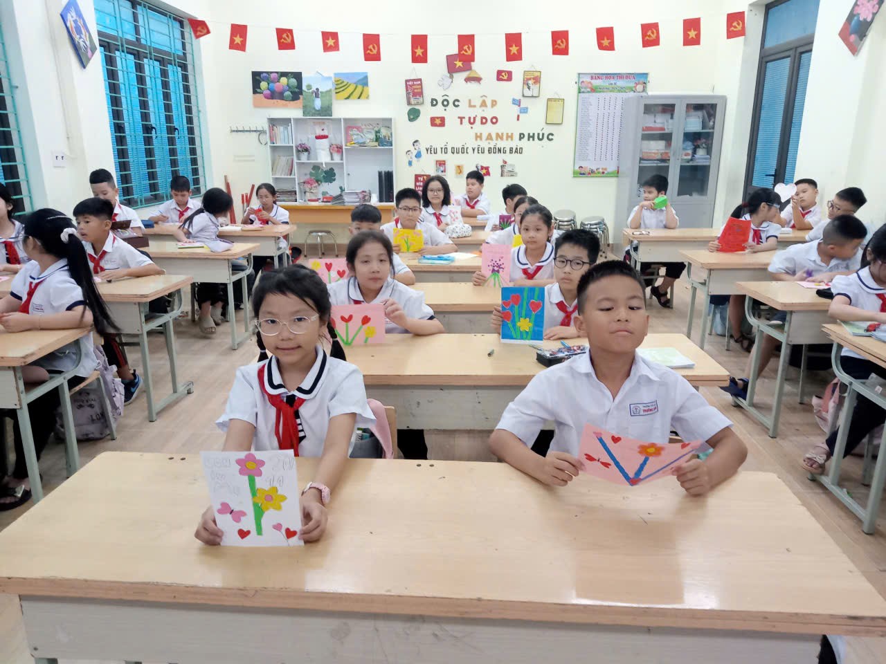 Các bạn học sinh hào hứng tự tay làm những tấm thiệp xinh xắn, gửi gắm lời chúc tốt đẹp đến cô giáo, mẹ và bà của mình. Hoạt động nhỏ nhưng ý nghĩa, giúp các em bày tỏ lòng biết ơn, tình yêu thương với những người phụ nữ thân yêu, đồng thời rèn luyện sự khéo léo và sáng tạo.