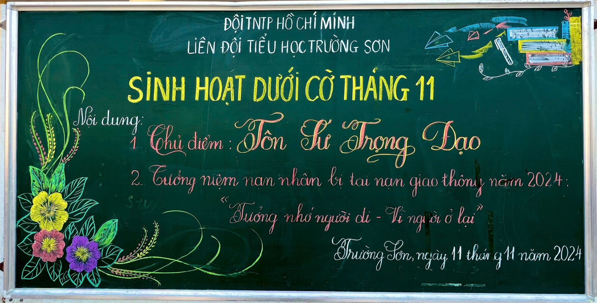 - Đồng thời, triển khai hoạt động của Liên đội trong tháng 11 - " Tôn sư trọng đạo" như: Đăng kí học tốt chào mừng 42 năm kỷ niệm ngày Nhà giáo Việt Nam 20/11; văn nghệ chào mừng...