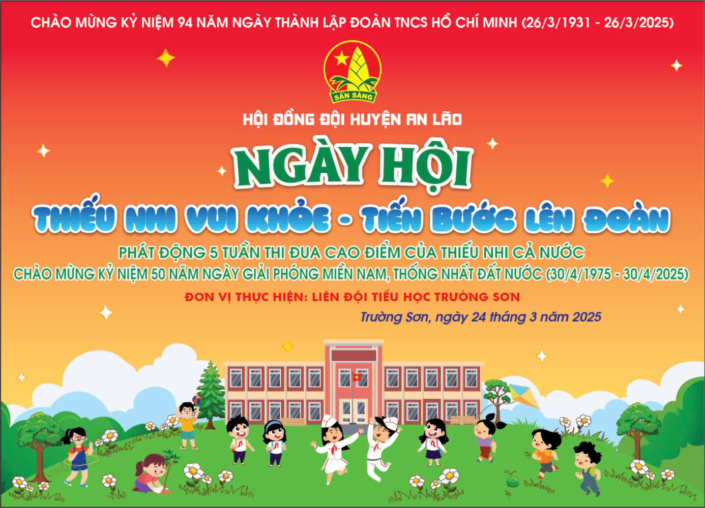 👉 Hôm nay, ngày 24/3/2025, trong không khí phấn khởi của thiếu nhi cả nước, trường Tiểu học Trường Sơn long trọng tổ chức Ngày hội “Thiếu nhi vui khỏe - Tiến bước lên Đoàn”, phát động 5 tuần thi đua cao điểm chào mừng 50 năm Ngày Giải phóng miền Nam, thống nhất đất nước (30/4/1975 – 30/4/2025).